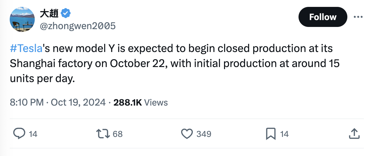บล็อกเกอร์รถยนต์ของจีนมีการแชร์ว่า Tesla Model Y ตัวใหม่ล่าสุด จะเริ่มการผลิตแบบปิด ที่โรงงาน Shanghai Gigafactory โดยมีปริมาณการผลิต 12 คันต่อวัน