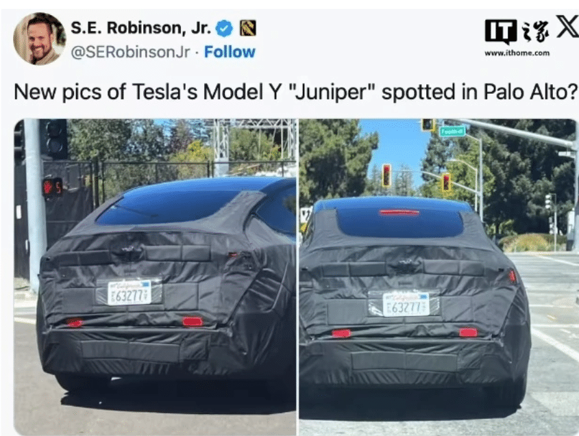 และตามกันมาติดๆ Blogger S.E. Robinson Jr. ได้มีการแชร์รูปภาพผ่านแพลตฟอร์ม X โดยเผยให้เห็นว่าเป็น Tesla Model Y ที่มีการพรางตัว โดยพบใน Palo Alto รัฐแคลิฟอร์เนีย สหรัฐอเมริกา